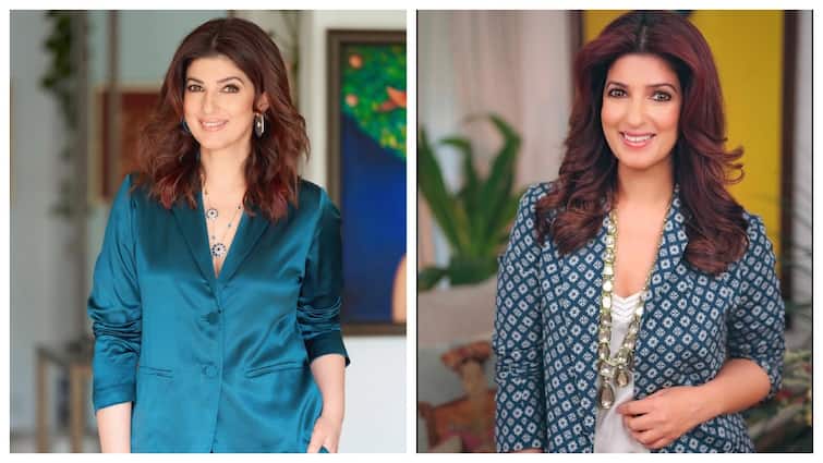 Twinkle Khanna is wearing a teal blue colored silky co-ord set in this look. It has blazer jackets and loose pants. He has completed the look with nude heels, open wavy hair and simple jewelery. This style looks classy, comfortable and modern.