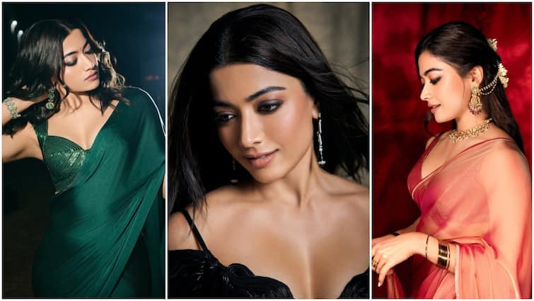 Rashmika Mandana is seen in a very beautiful dark green satin saree in this picture. The brightness of the saree is due to her fabric, which is making this look very glamorous. He is wearing it with a matching sleeveless blouse, in which his toned physical is seen. This look with open, light wavy hair and a bracelet is also very stylish with minimal accessories.