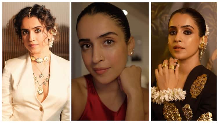 Sanya Malhotra is wearing a white and golden saree in this look, which she has paired with a white blazer. In this look, he has made his hair a blow, and is wearing a heavy necklace around his neck. He is wearing small tops in his ears and has also worn bangles in his hands. This look is a good combo of modern and traditional.