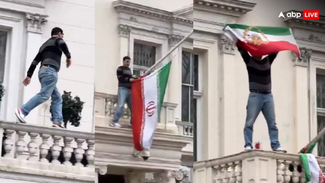 Video footage shows a protesting youth climbing up onto the balcony of the embassy building in Kensington, London, through the front windows and pillars on Friday (January 9, 2026), then pulling down the flag of the Islamic Republic flying on the roof of the embassy and replacing it with a flag with a historical symbol associated with the monarchy of Iran.
