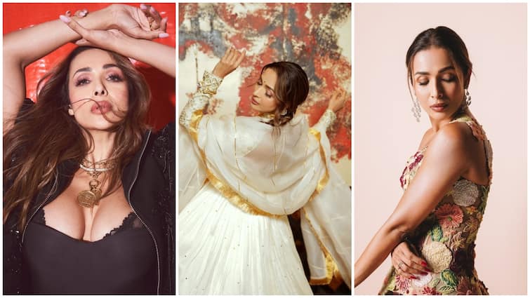 Here Malaika is in a modern ethnic avatar. She is wearing an off-white colored transparent saree, which has sequence and beads work on it. She has draped the saree in a stylish way instead of traditional, which has an off-shoulder blouse. There is a heavy multi-coloured necklace around her neck, which is giving a royal touch to her look. A small bindi on the forehead and open wavy hair complete her beautiful look.