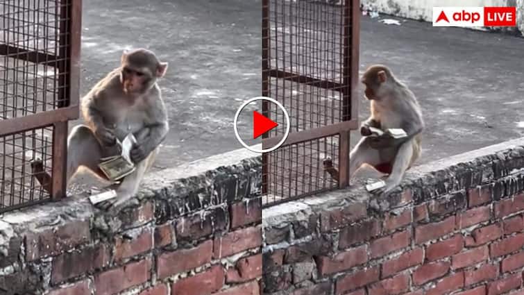 It can be seen in the video that a monkey is sitting on the wall of the roof of a house. A wad of notes is kept in front of him and he is picking up each note and counting it very carefully. The surprising thing is that the monkey has 500 rupee notes in his hand and he is counting in exactly the same manner as an accountant does in his office. Sometimes he turns the notes, sometimes he smiles after counting and then starts counting again. This sight brings laughter to the faces of the viewers and also leaves them astonished.