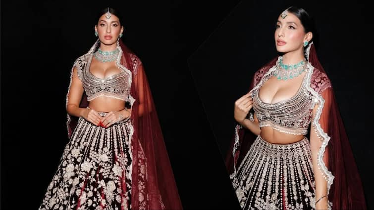 Nora Fatehi is wearing a maroon -colored heavy work lehenga. With which the actress carried a deepne blouse.