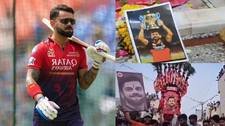 A video of a fan is going viral on social media, in which he is praying for the victory of RCB by placing the picture of Virat Kohli at the feet of God. At the same time, in another video, many Virat and RCB fans are seen performing the aarti of Kohli.