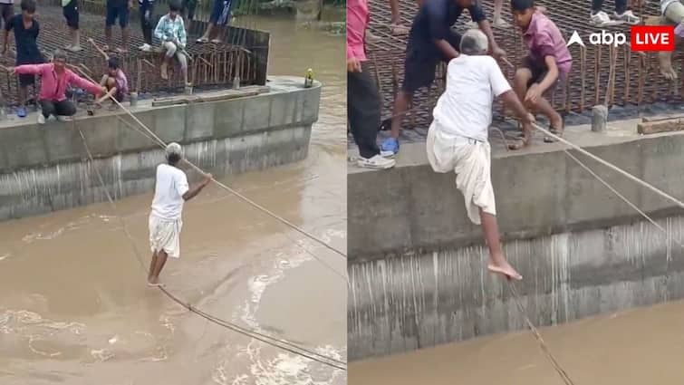 The continuous rains in many parts of the country have spoiled the situation a lot. Roads have drowned somewhere. So the bridges have been washed away somewhere. In such a situation, the movement on the paths is not free from danger for people. Meanwhile, a video is going viral on social media, in which an elderly person is seen crossing the strong flow of water with the help of a rope.