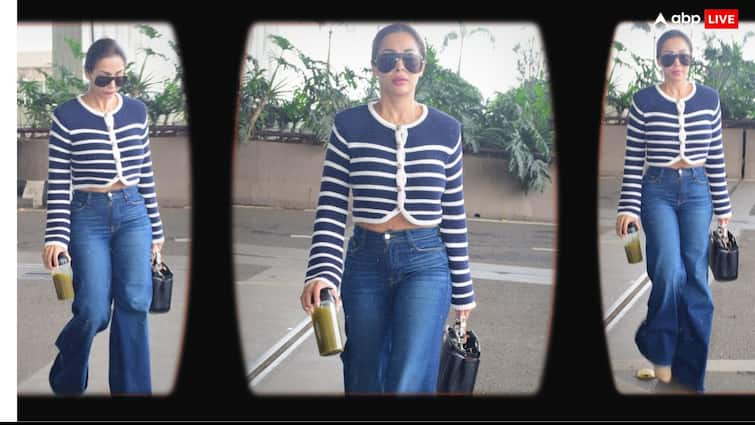 Malaika carried denim with blue and white crop tops. In which the actress was seen ploning her perfect figure.