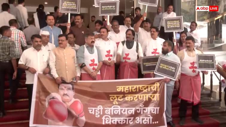 In Maharashtra, there is a dispute about Shiv Sena MLA Sanjay Gaikwad, Minister Sanjay Shirsat and Bharat Gogawale in Maharashtra. On Wednesday (July 16), MLAs of opposition parties demonstrated outside the assembly wearing vest and gamcha. Opposition legislators wore vest and swabs over the dress. During this time these leaders raised slogans of Gunda Raj.