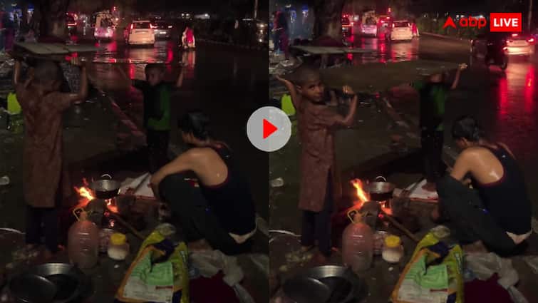 There are some videos that do not go into the depths of the heart, not for likes and views. This video viral on social media is also the same where rain drops are not just water, but the truth of poverty. On the sidewalk, under the open sky, a poor father is cooking on the stove. But this story is not just about his struggle, but of those two little hands that are standing not to a toy, but a wooden slab so that water does not fall in the food vessel. The slab is placed on the vessel as if it is a roof and its pillars, in the innocent hand, at the age of which there should have been school books or copies of color.