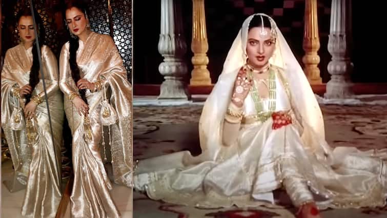 In this classic song by Mughal-e-Azam, Rekha played Anarkali with a white-golden costume, heavy jewelery and veil. Here Manish Malhotra has recited the same vintage ethnic ethics through modern Banarasi saree. With these pictures, famous designer Manish Malhotra has written the caption that he has styled Rekha ji in a special silver tissue saree, which is inspired by the fun of the film Umrao Jaan. This look is such a statement on a red carpet or an award show which only Rekha ji can complete.