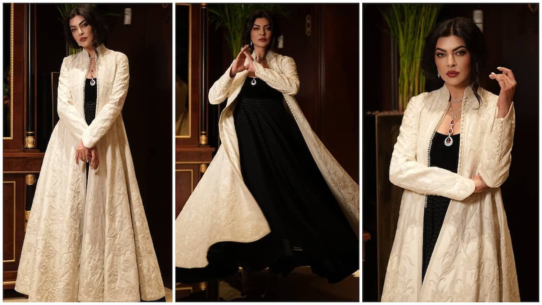 In the viral photos, Sushmita Sen wore a long white cape jacket with a black gown, which is further enhancing her entire look. With this she has carried a statement stone neckpiece. She also completed her overall look with heavy makeup.