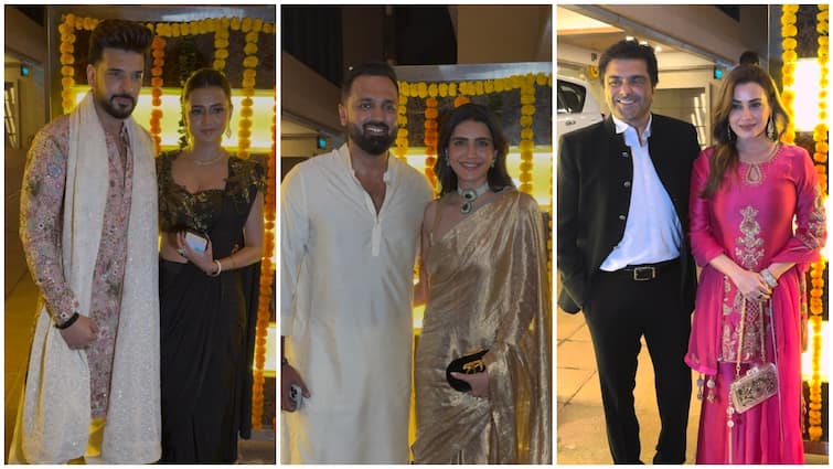 In the picture, Karan Patel and Ankita Bhargava are seen in a beautiful style at Ekta Kapoor’s Diwali party. Karan Patel is wearing a black sheer kurta, under which he is wearing black pajamas. At the same time, Ankita Bhargava is also in a black colored kurta dhoti set, whose kurta has beautiful multi-coloured embroidery and mirror work. She is wearing a white pearl potli bag and golden colored shoes, which is making her look festive and classy. Both of them have created excellent coordination with each other by choosing black colored outfits.