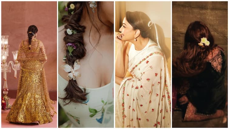 This hairstyle of Trupti Dimri on Rakshabandhan will look very royal and elegant. In this, the hair is tied in a clean low bun, which is decorated with rose flowers from behind. Some of the light curled hair on the front of the face are left open, which is giving grace in the look. This style is perfect with heavy jewelery.