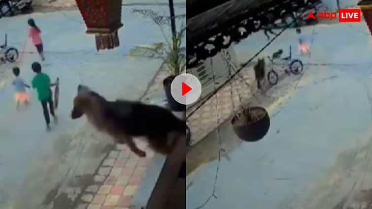 In this CCTV footage that is going viral on social media, it is clear that 3-4 children are playing in the street of the locality. Then suddenly a stray dog runs after seeing the youngest child of them. The child is not able to recover in fear that the pet German Shepherd, who is peeping out of the house, gets an eye on him and he gets alerted. In a moment, he jumps on the road straight and runs towards the attacking dog without losing time.