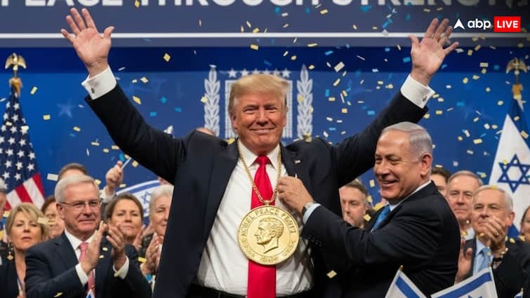 In the AI generated photo shared by Netanyahu, US President Donald Trump is shown wearing the prestigious Nobel Peace Prize medal around his neck. In this picture, Prime Minister Benjamin Netanyahu is also standing with Trump and flags of Israel and America are waving nearby. There is applause and confetti is raining all around. At the same time, Trump is seen celebrating wearing the Nobel Peace Prize medal. There is a banner in the backdrop of this picture, which reads, ‘Peace Through Strength.’