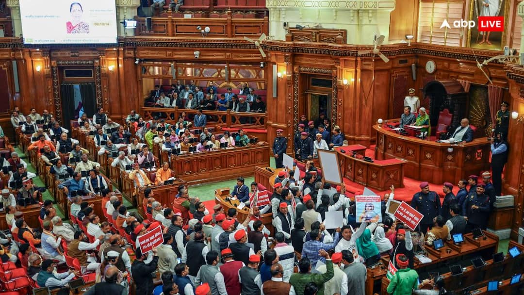 During the discussion on the budget, the atmosphere in the Uttar Pradesh Assembly became heated on Wednesday evening when a heated argument broke out between Fisheries Department Minister Sanjay Nishad and Samajwadi Party MLAs. Expressing protest, SP MLAs reached the Well and started creating a ruckus. Meanwhile, SP MLAs snatched the papers from the minister’s hand, which led to a scuffle between the two parties. Minister of State for Parliamentary Affairs Mayankeshwar Sharan Singh complained to the bench, calling it an attempt to attack the minister.
