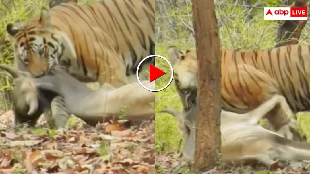In the viral video, it can be seen that the tiger has hunted a big cow. Looking at the size and weight of the cow, it can be judged that it is not a light prey. Still, without much effort the tiger presses it in its jaws and with one stroke picks it up and moves ahead. Tourists standing nearby sitting in safari vehicles are capturing this scene on camera. As soon as the tiger senses the presence of people, it quickly moves towards the dense forest for hunting.