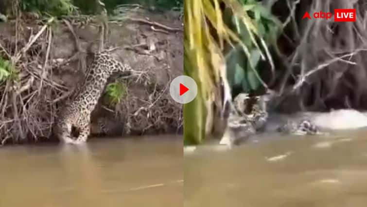 In this viral video, it can be seen that a panther is sitting on the banks of a flowing river and his eyes are fixed on a crocodile floating on the surface of the water. This crocodile was also very careless in his world, but what did he know that his peace is going to turn into a storm in a few moments. The panther chases the crocodile floating in the water for a long time and is hidden in search of the right opportunity. Both his cleverness and patience are worth seeing. Suddenly, at the speed of electricity, the panther jumps into the water and breaks directly on the crocodile. His jaws hold the crocodile’s neck. There is a fierce struggle in water.