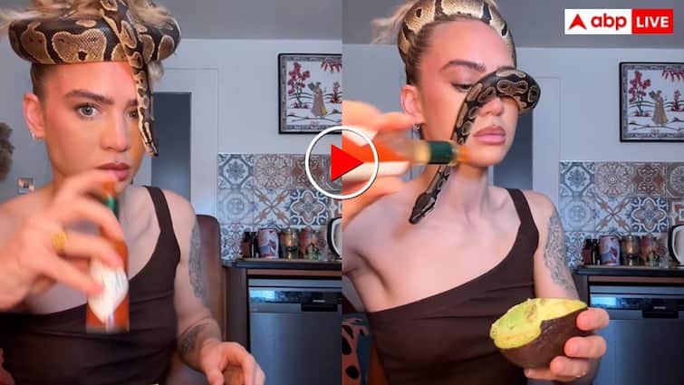 Every day in the world of social media one gets to see something or the other that makes it difficult to believe what a person is doing. Sometimes a person is seen playing with snakes and sometimes someone presents a unique example of friendship with animals. Now a similar video is creating a stir on the internet in which a woman is sitting in the kitchen eating food comfortably, but there is something on her head which has left everyone with tears in their eyes. Actually, the woman has wrapped a dangerous python around her head like a towel.